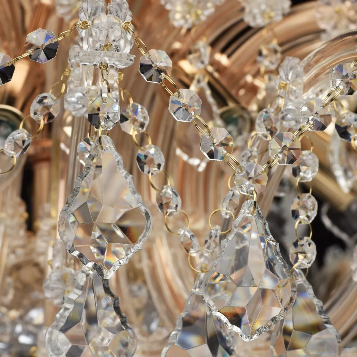 Металлическое основание цвета золота, декоративные элементы из хрусталя, стекла и акрила